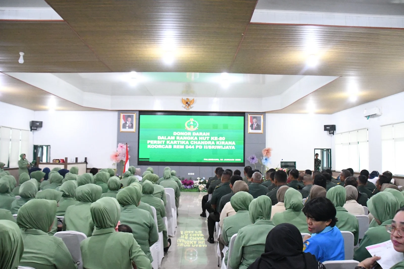 Dalam rangka memperingati Hari Ulang Tahun ke-80 Persit Kartika Chandra Kirana, bertempat di Aula Makorem 044/Gapo, Persit KCK Koorcab Rem 044 PD II/Sriwijaya menyelenggarakan kegiatan donor darah sebagai wujud nyata kepedulian sosial kepada masyarakat, Kamis (22/1/2026).