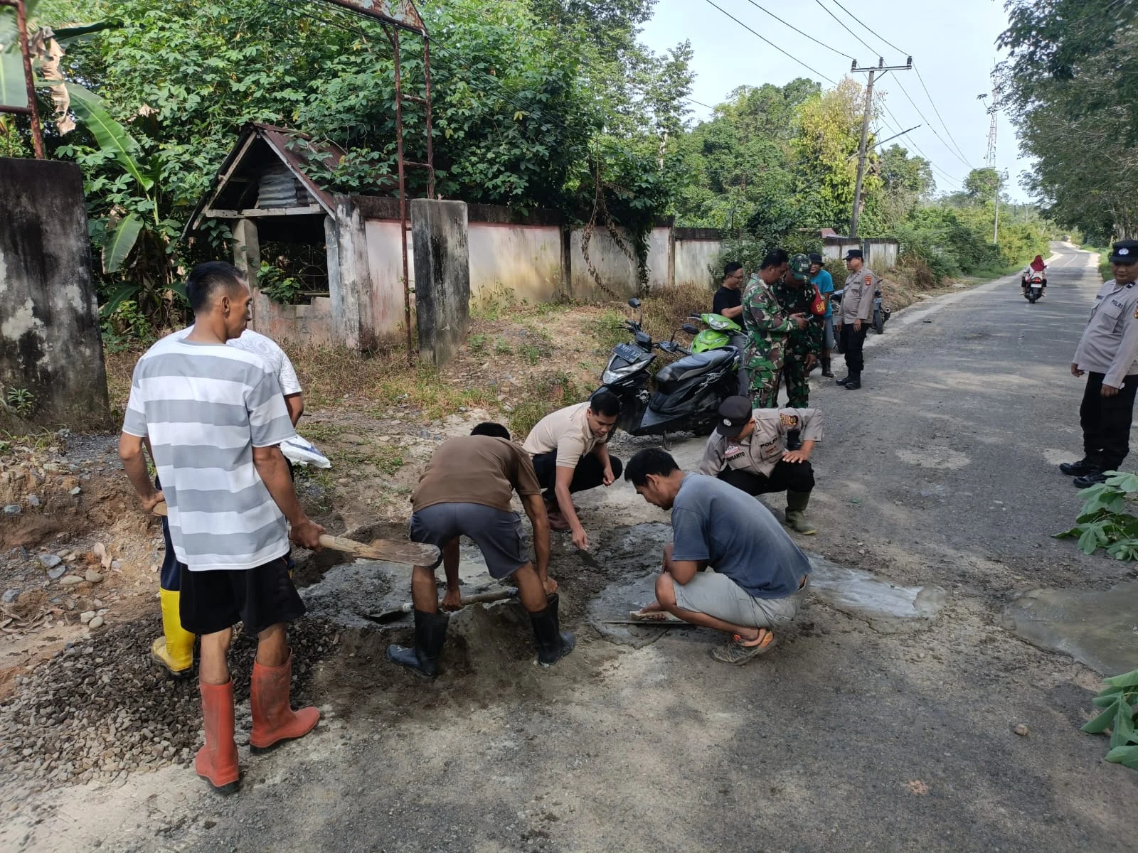 Personel Polsek Rambang bersama Forkopimcam melaksanakan pembersihan sampah, penataan drainase, penambalan jalan berlubang, serta penertiban rumput liar secara serentak.