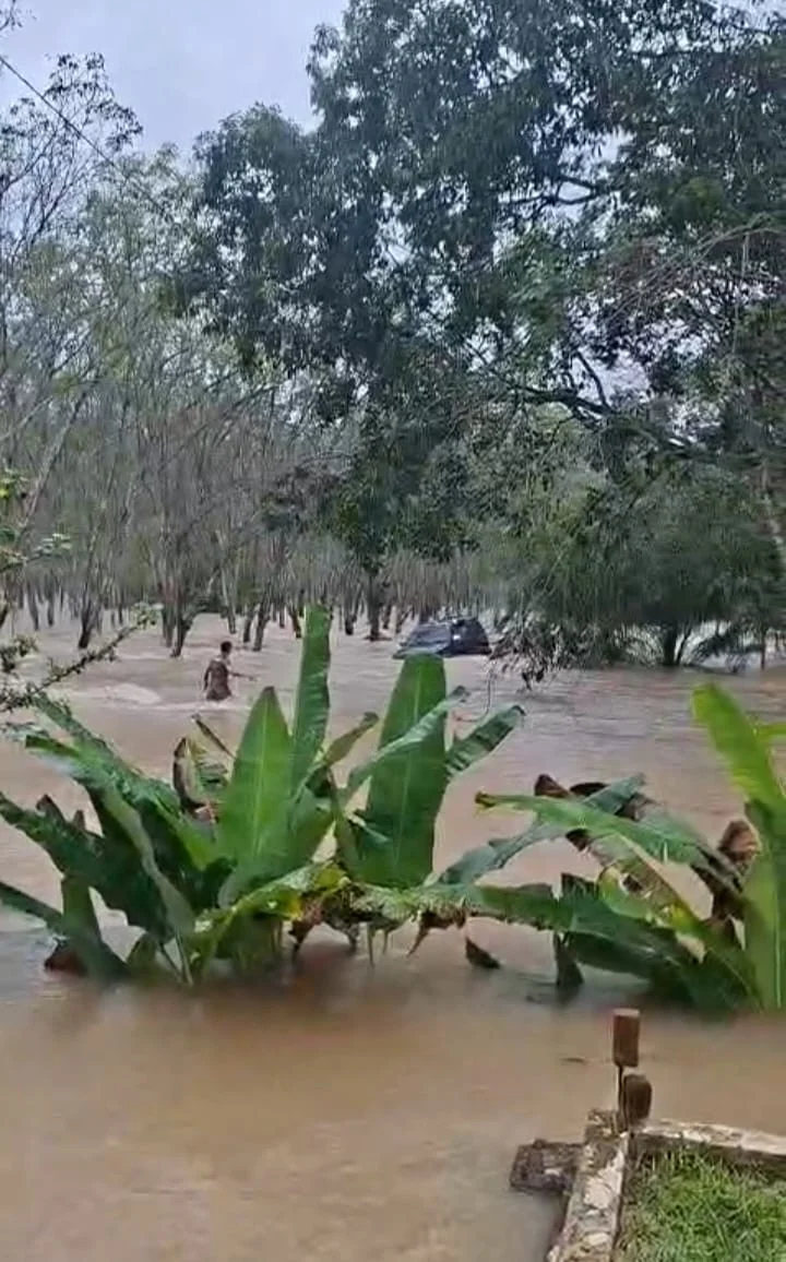 Dalam hasil pantauan di lapangan, terjadi insiden saat seorang warga Desa Trikarya bernama Hasan (40) bersama istri dan anaknya menggunakan satu unit mobil Isuzu Panther berupaya menerobos derasnya arus banjir dengan pendampingan Bhabinkamtibmas. Namun, kendaraan tersebut terseret arus dan hanyut.