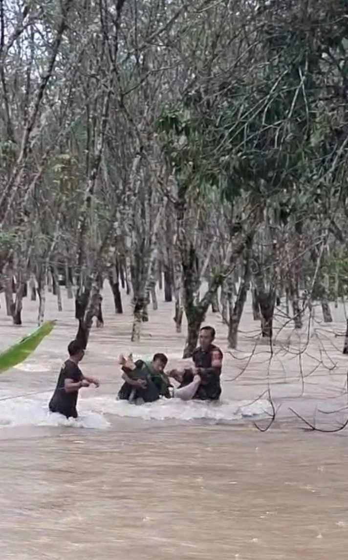 OKU Timur –zonanusantara.my.id-Babinsa Desa Karang Jadi Koramil 403-04/Belitang, Serda Iwan, bersama Bhabinkamtibmas setempat bergerak cepat evakuasi warga yang terseret arus banjir, Kamis (8/1/2026).