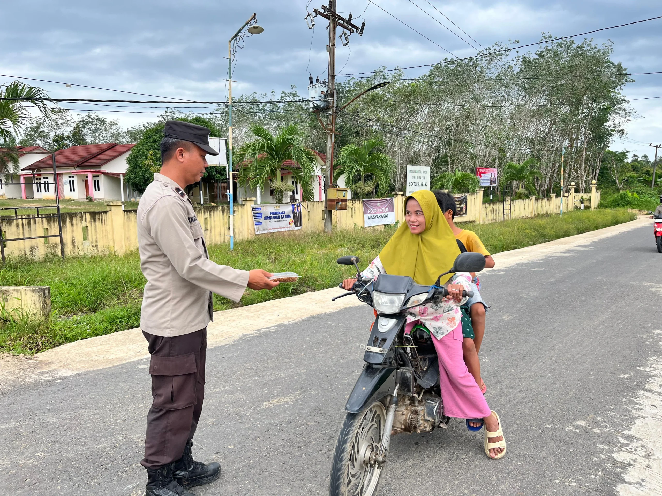 Menjelang waktu berbuka puasa, Ps Kanit Binmas Polsek Rambang Aipda Toto Susanto dan Bhabinkamtibmas Aipda Kharis Natalleza membagikan takjil kepada masyarakat yang sedang melintas di Desa Sugihwaras Barat, Kecamatan Rambang. Jumat (20/2/2026) sore. Kegiatan ini merupakan bagian dari rangkaian acara rutin yang digelar Polsek Rambang selama bulan suci Ramadhan 1447 H.