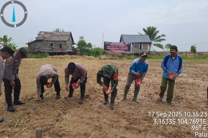 Ogan Ilir.Zonanusantara.my.id. – Dalam rangka mendukung program pemerintah terkait ketahanan pangan, Polsek Pemulutan bersama unsur terkait melaksanakan kegiatan penanaman jagung di Desa Palu, Kecamatan Pemulutan, Kabupaten Ogan Ilir pada Rabu (17/9/2025) pukul 10.00 WIB.