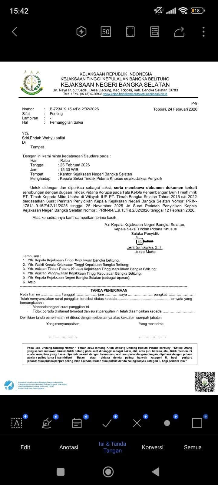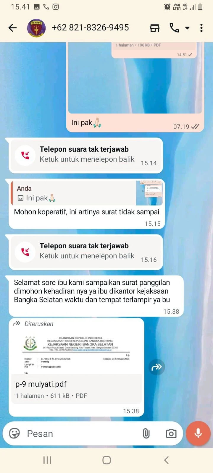 Kronologi Kejadian Kasus bermula ketika Mulyati dan Endang menerima pesan WhatsApp dari nomor tak dikenal serta surat panggilan yang mengatasnamakan staf Kasi Pidsus Kejari Basel. Surat tersebut memerintahkan keduanya hadir sebagai saksi dalam penyidikan dugaan tindak pidana korupsi tata kelola penambangan bijih timah milik PT Timah di wilayah IUP Bangka Selatan periode 2015–2022. Dalam penjelasanya itu tercantum ancaman bahwa jika tidak hadir, mereka akan dijemput paksa.