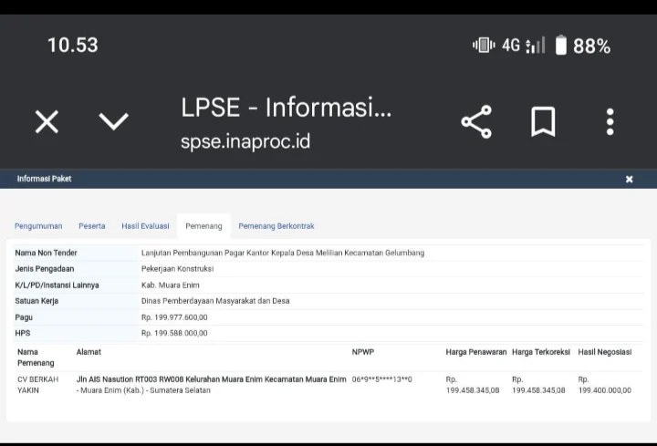 Pada Jumat, 28 Oktober 2025, tim Media Zona Nusantara melakukan kontrol sosial di lapangan. Di lokasi proyek terpampang papan informasi jelas menyebut pelaksana adalah CV Dika Pratama. Namun fakta berlawanan muncul ketika dicek melalui LPSE Kabupaten Muara Enim, di sana tercatat pemenang lelang proyek justru CV Berkah Yakin dengan pagu anggaran Rp 199.977.600,00.