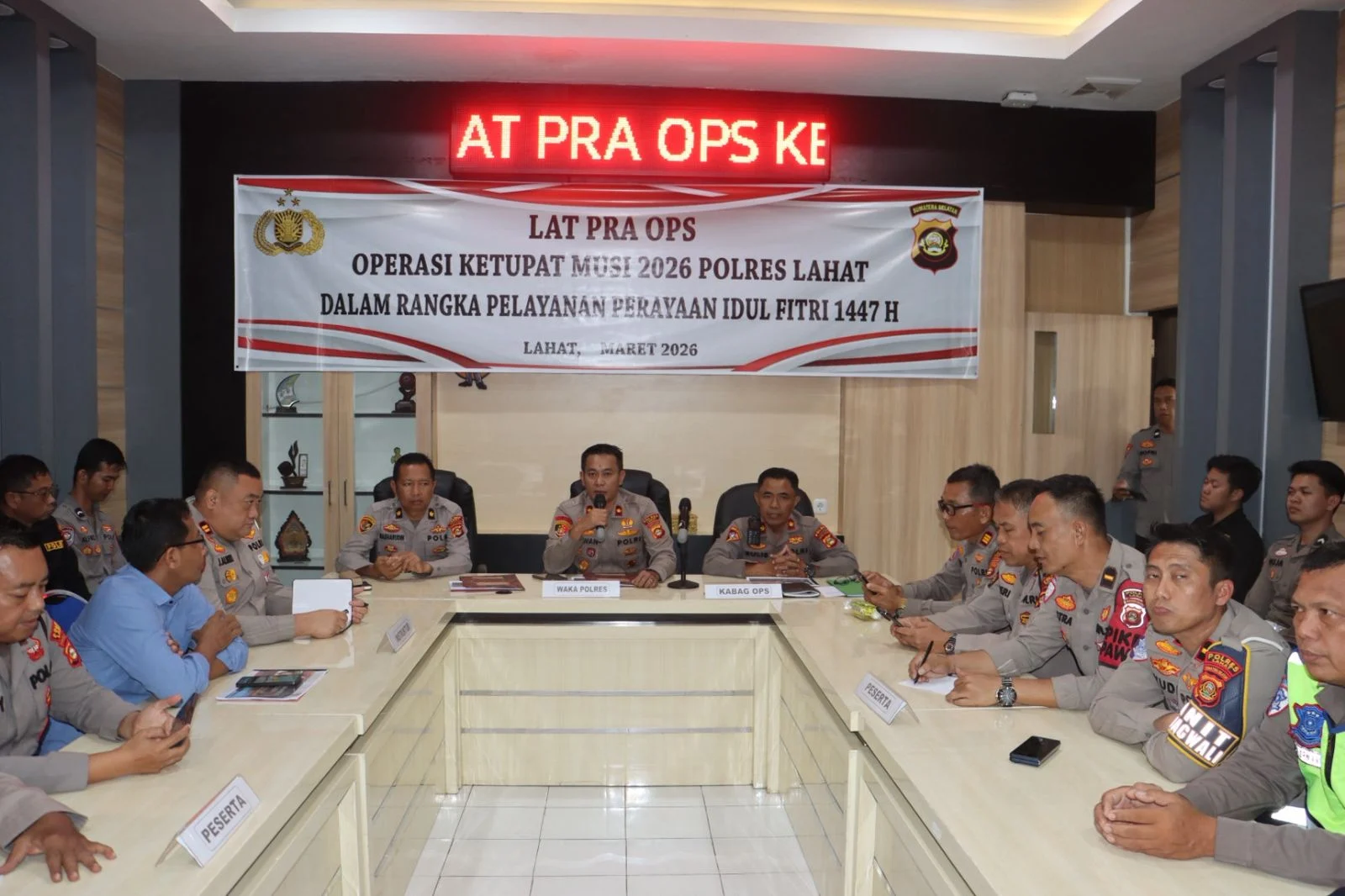 pada hari selasa 10 maret 2026, Kapolres Lahat AKBP Novi Edyanto SIK.MIK, yang di dampingi Waka Polres Kompol Liswan Nurhapis SH, Kabag Ops Kompol Sulis Pujiono SH, Kabag Log Kompol Nasharuddin SH.MH, membuka dan memimpin giat Lat Pra Ops Ketupat Musi 2026 dalam Rangka Pelayanan Perayaan Idul Fitri 1447 H.Latihan Pra Ops merupakan bagian penting dari upaya meningkatkan kesiapan personel dalam mengamankan perayaan Hari Raya Idul Fitri1447 H, tahun 2026. Kegiatan ini bertujuan untuk memberikan pemahaman menyeluruh kepada seluruh personel mengenai cara bertindak, prosedur pengamanan, serta strategi pelayanan kepada masyarakat selama masa arus mudik dan arus balik.
