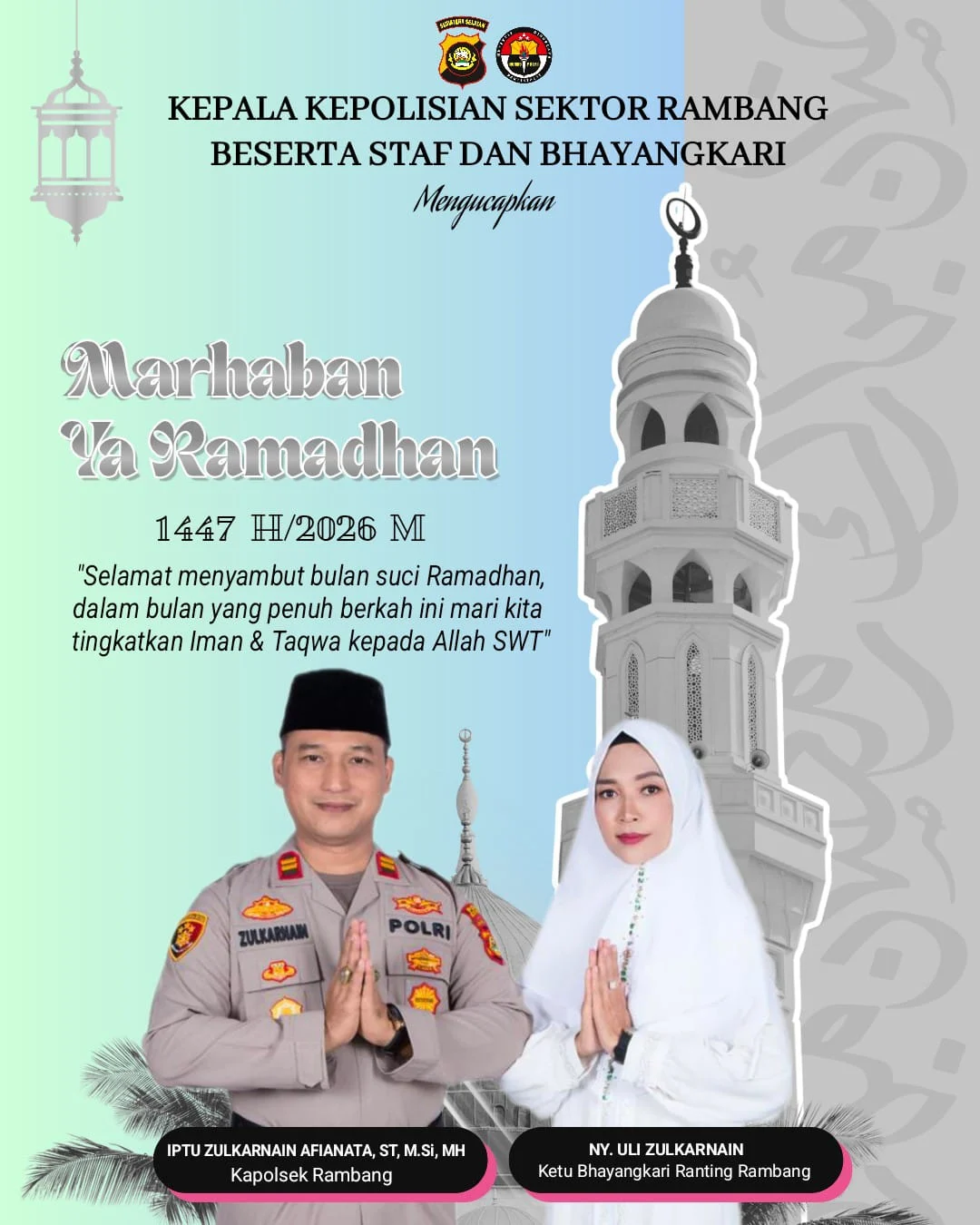Kapolres Muara Enim AKBP Hendri Syaputra, SIK, melalui Kapolsek Rambang IPTU Zulkarnain Afianata, ST, M.Si, MH, didampingi Ketua Bhayangkari Ranting Rambang Ny. Uli Zulkarnain beserta seluruh jajaran personel, secara resmi mengucapkan “Marhaban Ya Ramadhan, Selamat Menunaikan Ibadah Puasa 1447 Hijriyah” bagi seluruh umat Muslim.