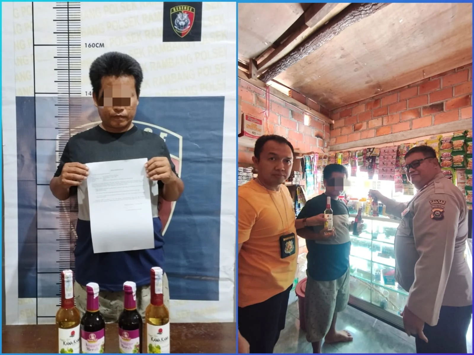 Dari lokasi tersebut, petugas mengamankan satu orang penjual beserta bukti barang berupa minuman keras tanpa izin sebanyak 2 botol jenis Anggur Merah dan 2 botol minuman keras jenis Kawa-kawa.