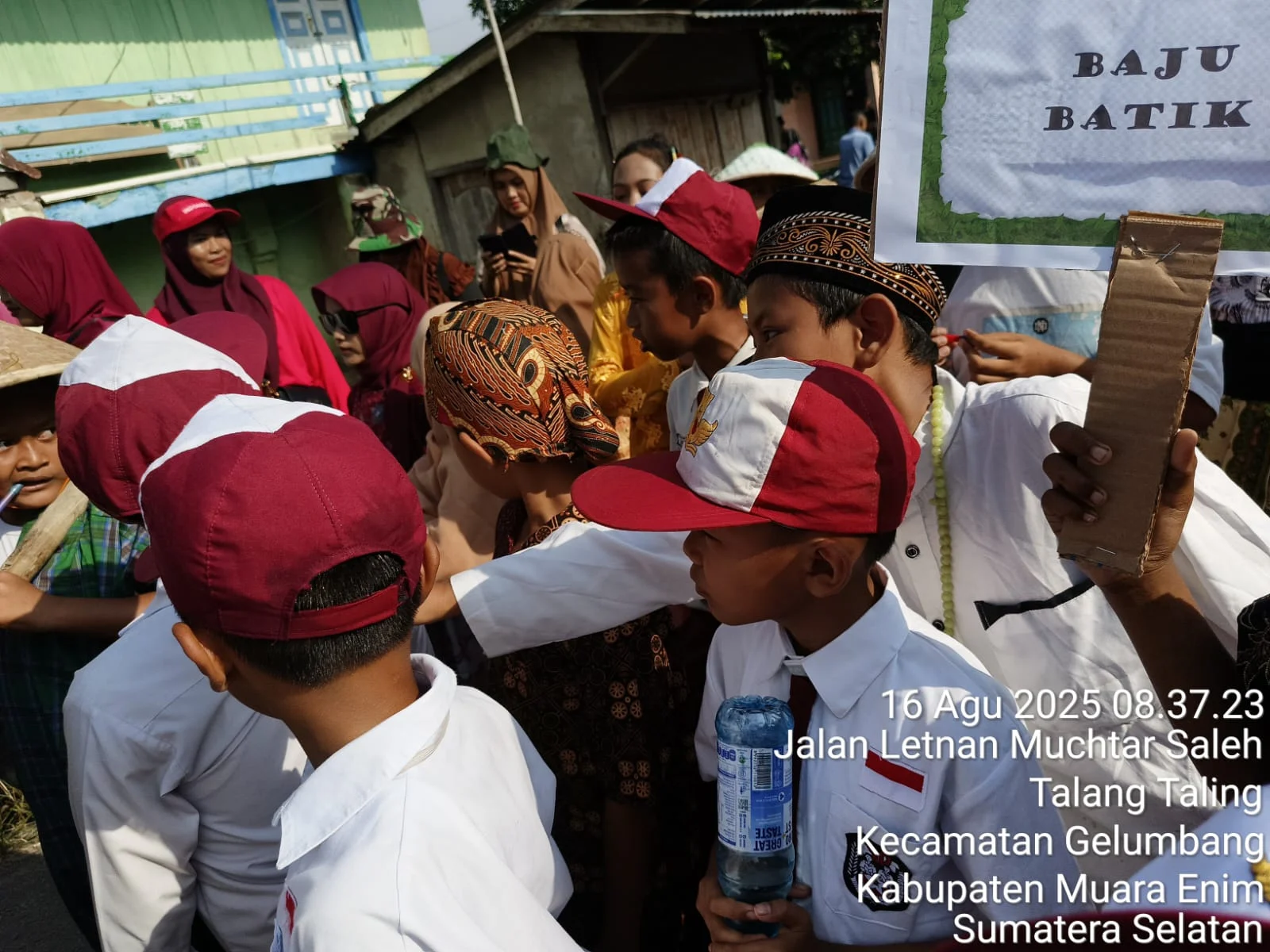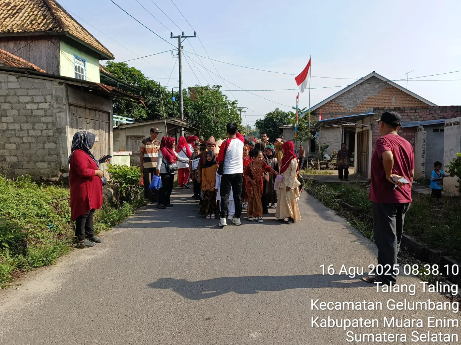 Pawai bocah yang mengambil lokasi start di SD N 23 Talang Taling menuju jalan Utama penghubung talang tengah dan Desa Lainnya Sabtu (16/08/2025).