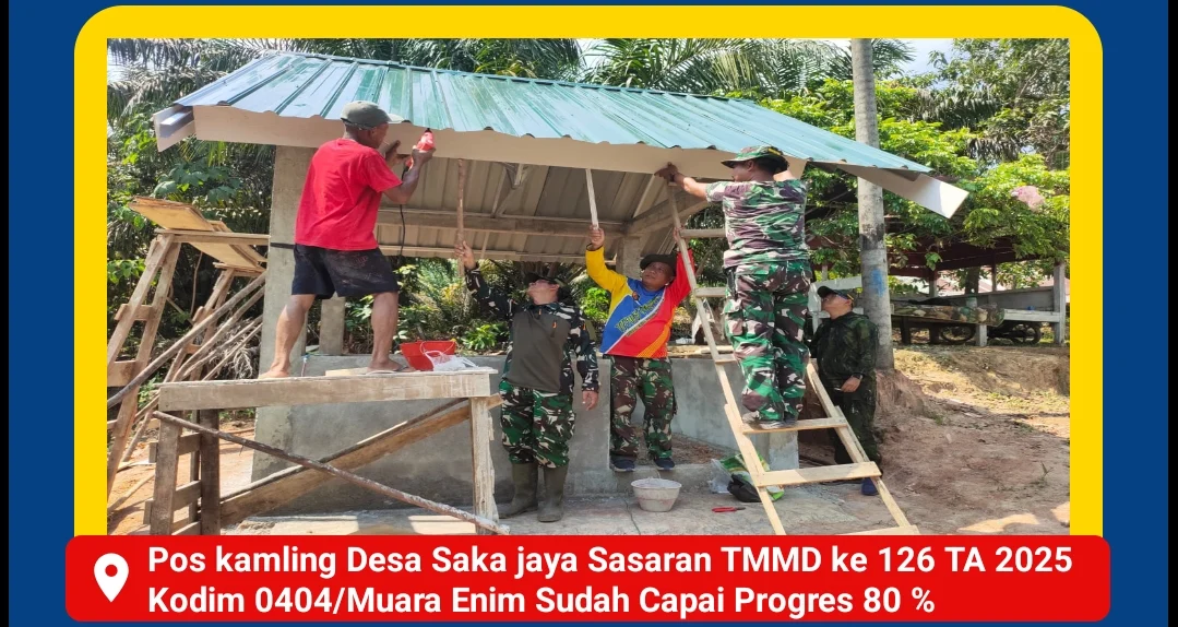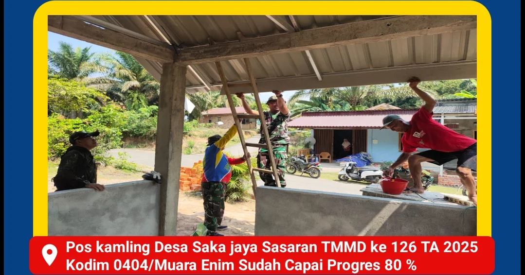 Muara Enim, Zonanusantara.my.id – Pembangunan Pos Kamling yang berlokasi di Dusun 4 RT 10 Desa Saka Jaya, Kecamatan Muara Enim, Kabupaten Muara Enim, terus dikebut dan kini telah mencapai progres 80%. Koordinator lapangan, Kapten Inf Narko, menyampaikan kabar gembira ini saat meninjau langsung lokasi pembangunan pada Sabtu (18/10/2025).
