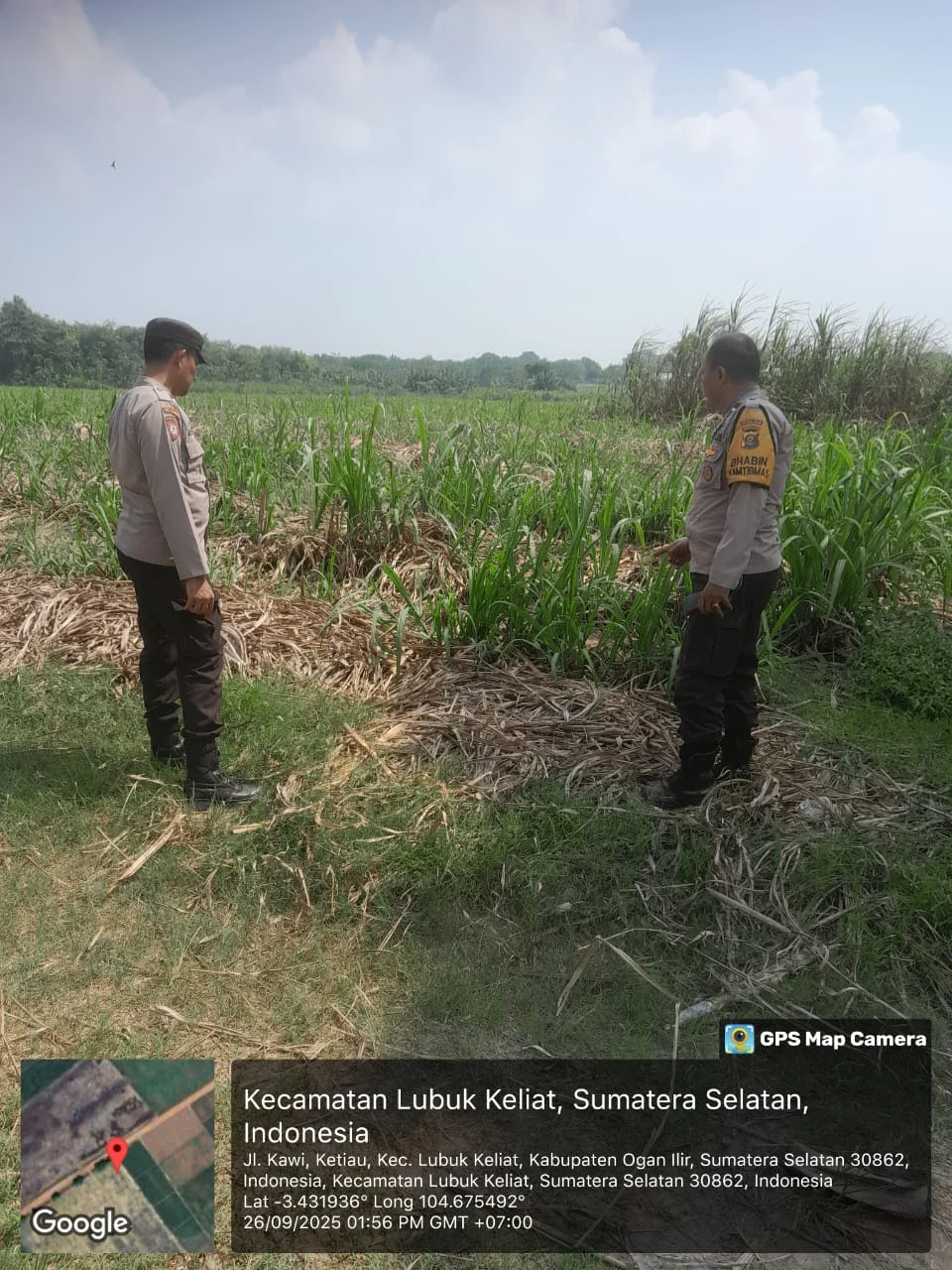 Dalam patroli tersebut, lokasi yang menjadi fokus pengawasan berada di koordinat -3.431922° 104.675471°, dengan luas lahan sekitar ±5 hektar. Vegetasi didominasi tanaman tebu di atas lahan mineral milik PTPN VII Cinta Manis.
