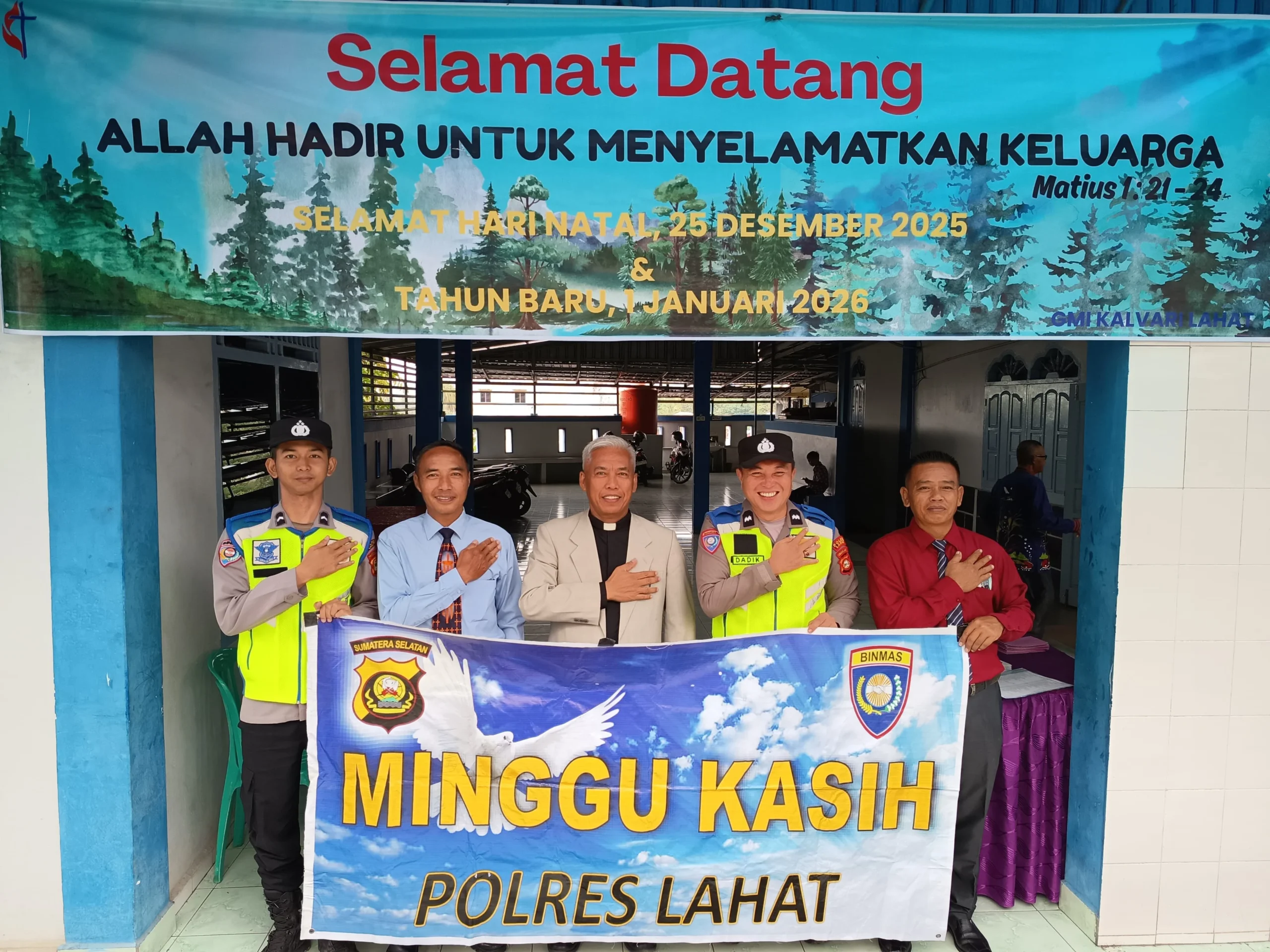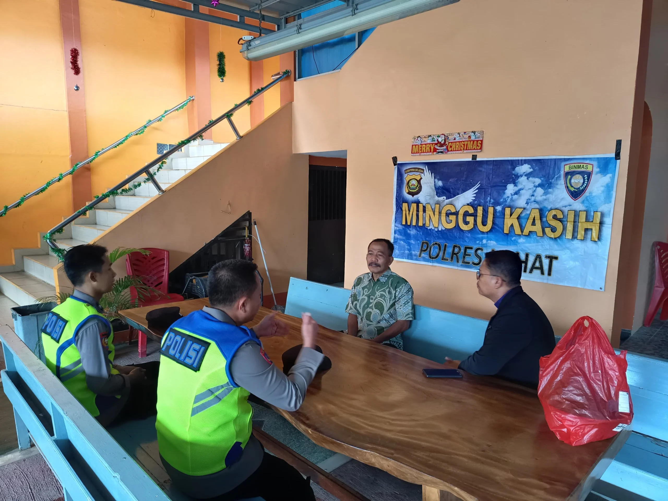 Kasat Binmas Polres Lahat AKP Heri Jon Pazri SH, yang di dampingi Aipda Dadik Oktapianto SH.MM dan, personel Sat Binmas berdialog langsung dengan para pendeta dan pengurus paroki gereja. Petugas menyampaikan pesan-pesan kamtibmas serta mengajak tokoh agama untuk bersama-sama berperan aktif dalam menjaga keamanan dan ketertiban di lingkungan sekitar. Komunikasi yang terjalin diharapkan dapat menjadi sarana deteksi dini terhadap potensi gangguan keamanan.