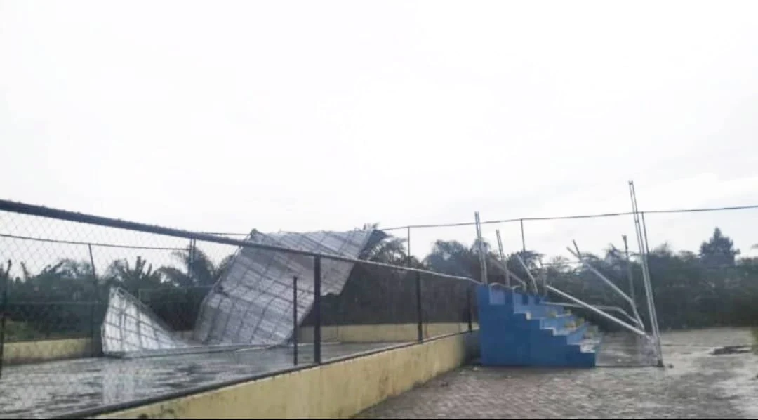 Pantauan Tim media di lapangan, menunjukkan kondisi tribun tersebut sangat memprihatinkan, rangka baja terjadi ambruk bersamaan dengan atap tribun sudah beterbangan.