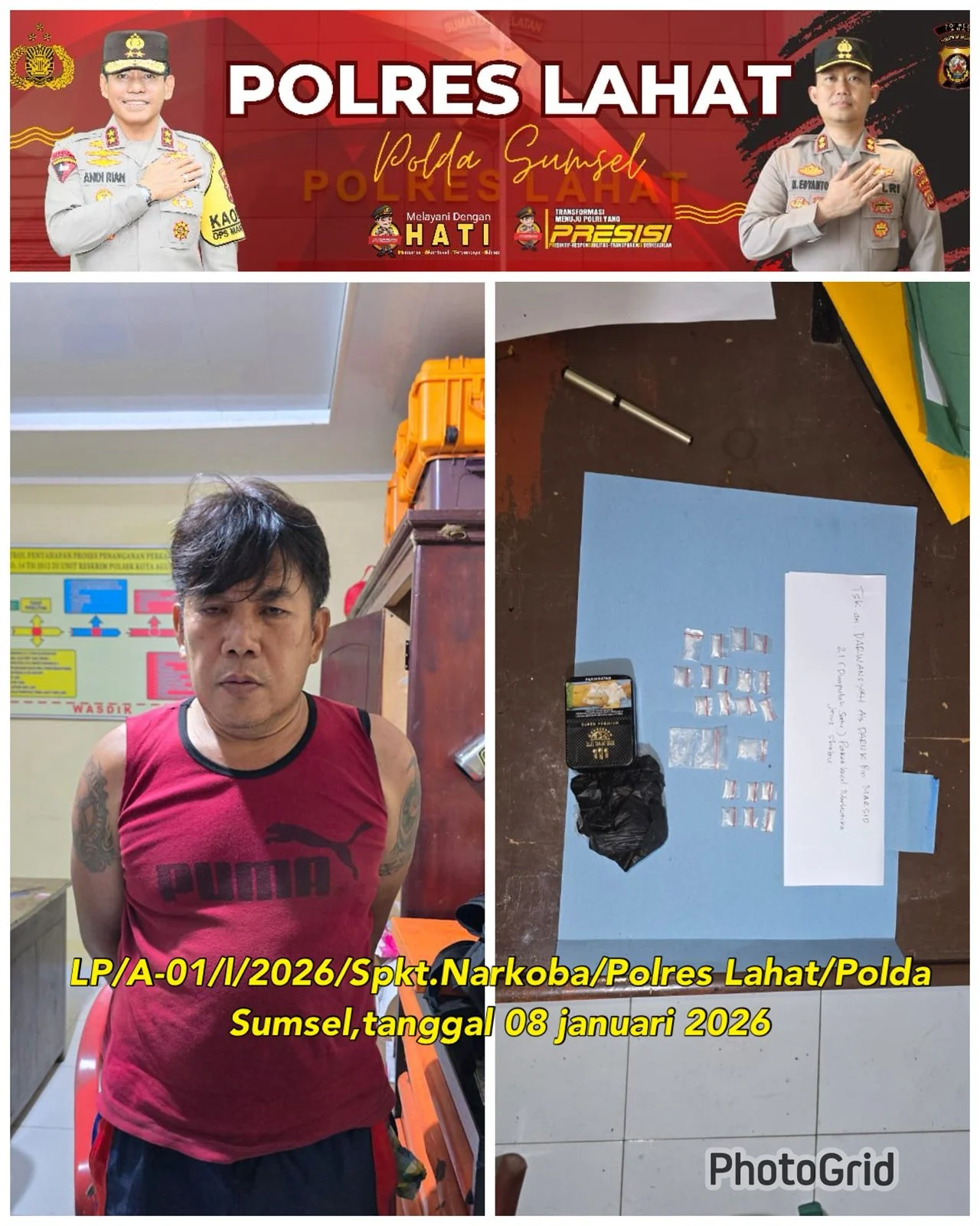 jajaran Satresnarkoba , Polsek Kota Agung telah berhasil ungkap kasus Tindak Pidana Narkoba berdasarkan Laporan Polisi LP / A / 01 / I / 2026 / Spkt.Narkoba / Polres Lahat / Polda Sumsel, tanggal 07 Januari 2026.