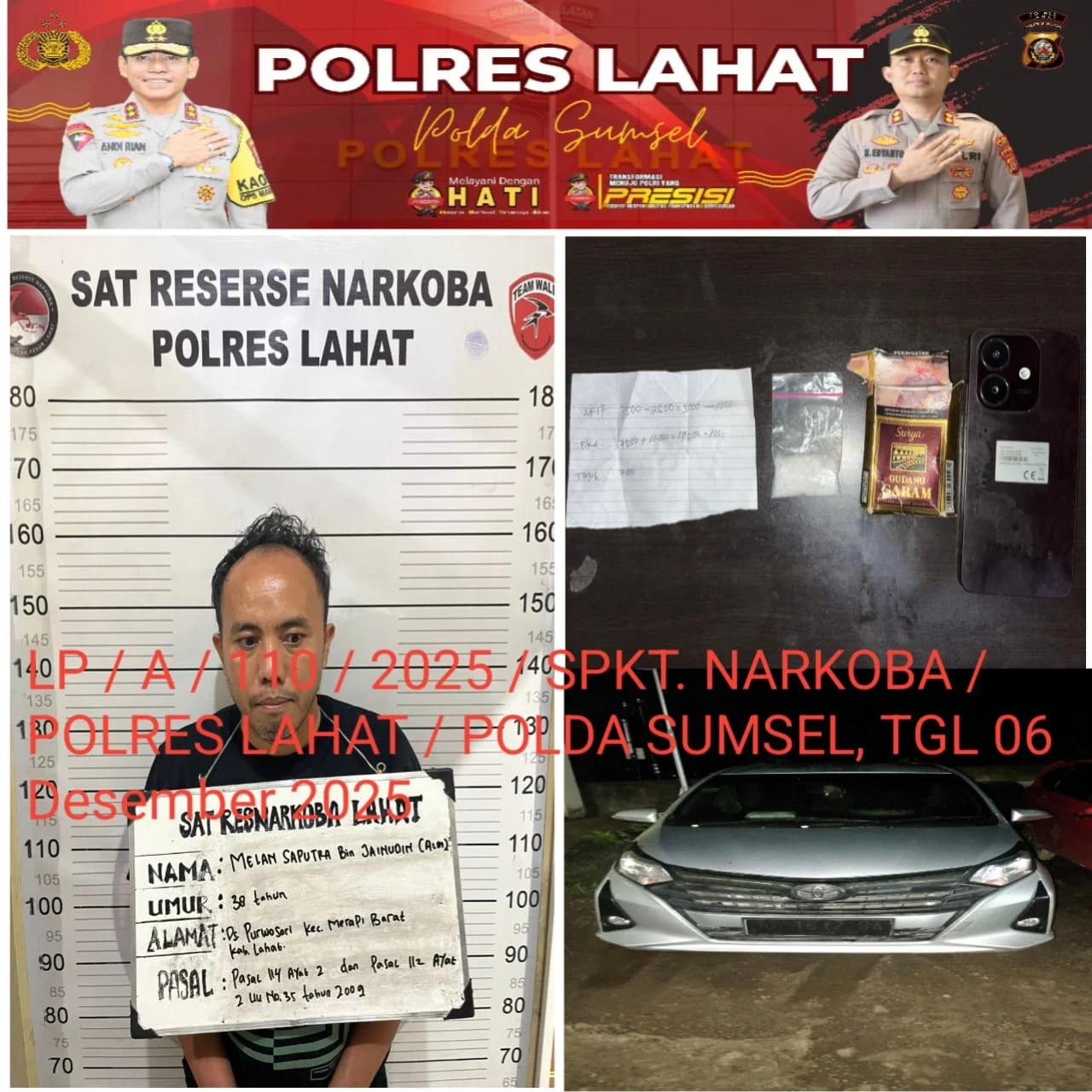 Selanjutnya Kasat Res Narkoba Polres Lahat memerintahkan Anggotanya untuk melakukan penyelidikan. Setelah sasaran dan ciri – ciri kendaraan serta orang tersebut telah diketahui, pada hari rabu tanggal 10 Desember 2025 sekira jam 17.00 wib Personil Sat Res Narkoba melakukan pembuntutan terhadap 1 (satu) unit Mobil Calya warna silver metalik dengan No.Pol: BG 1612 SA dari Desa Muara Temiang Kec merapi barat sampai dengan Jl. Beringin Desa manggul Kec. Lahat Kab. Lahat, terlihat kendaran yg dicurigai tersebut berhenti kemudian terduga turun meletakkan kotak rokok dilantai tepatnya dibawah tiang depan ruko kosong di JL. Beringin Desa Manggul Kec. Lahat Kab. Lahat tsb kemudian terduga langsung naik kembali kemobil lalu pergi, anggota sat narkoba kembali membuntuti kendaraan tsb, pada saat kendaran tsb berhenti di depan Pegadaian Lahat di JL. Mayor Ruslan II Kel. Pasar Baru Kec. Lahat Kab. Lahat, anggota Sat Res Narkoba langsung mengamankan tersangka a.n MEILAN SAPUTRA Bin ZAINUDIN (Alm) lalu dilakukan penggeledahan di dalam Mobil milik tersangka dan didapatkan 1 (satu) unit Handphone Android merek Oppo A3X warna ungu dan 1 (satu) lembar kertas warna putih yang berisikan tulisan catatan hutang penjualan Narkotika jenis sabu.