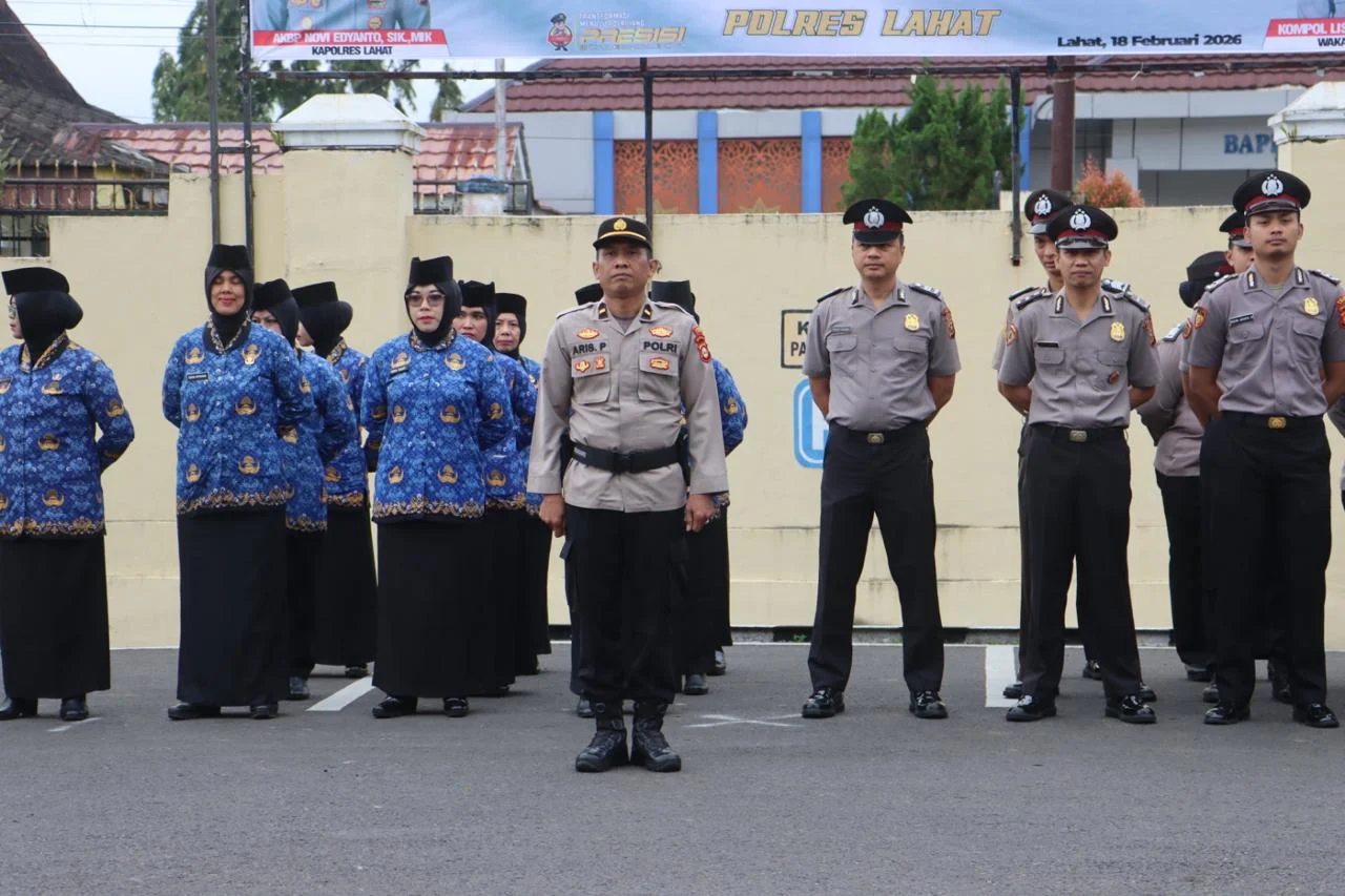 pada hari rabu 18 februari 2026, Kapolres Lahat AKBP Novi Edyanto SIK.MIK memimpin Upacara Hari Kesadaran Nasional yang dilaksanakan di halaman Mapolres Lahat berlangsung dengan khidmat dan tertib. Seluruh jajaran personel Kepolisian Resor Lahat mengikuti kegiatan tersebut dengan penuh disiplin, mulai dari pejabat utama, para perwira, hingga bintara dan ASN. Upacara rutin yang digelar setiap tanggal 17 ini menjadi momen penting untuk memperkuat komitmen pengabdian kepada masyarakat, bangsa, dan negara.